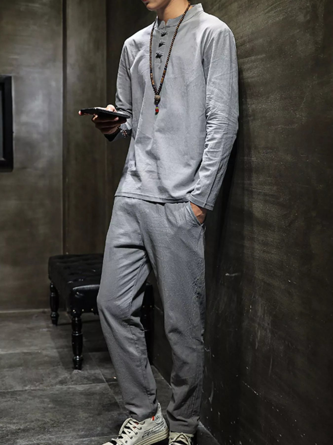 Men's Plus Size Button Detail Long Sleeve Top and Pants Set